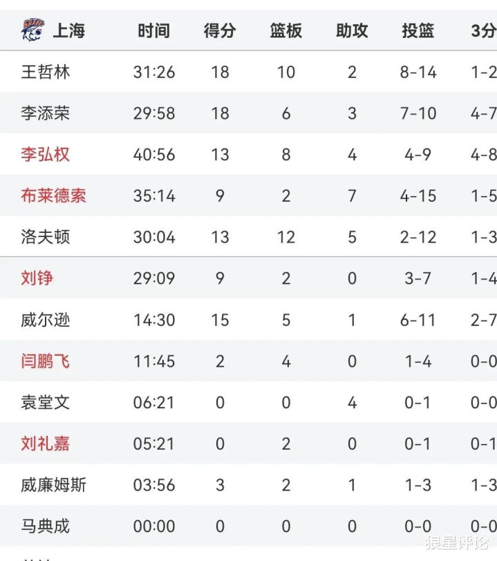 * 王哲林: 本场比赛王哲林虽然因伤退场,但仍然贡献了18分10篮板的数据,展现了其强大的内线统治力。他的拼搏精神和领导能力鼓舞了全队,是上海队取胜的关键因素之一。 他的受伤也为比赛增添了遗憾,希望他能够尽快康复。
