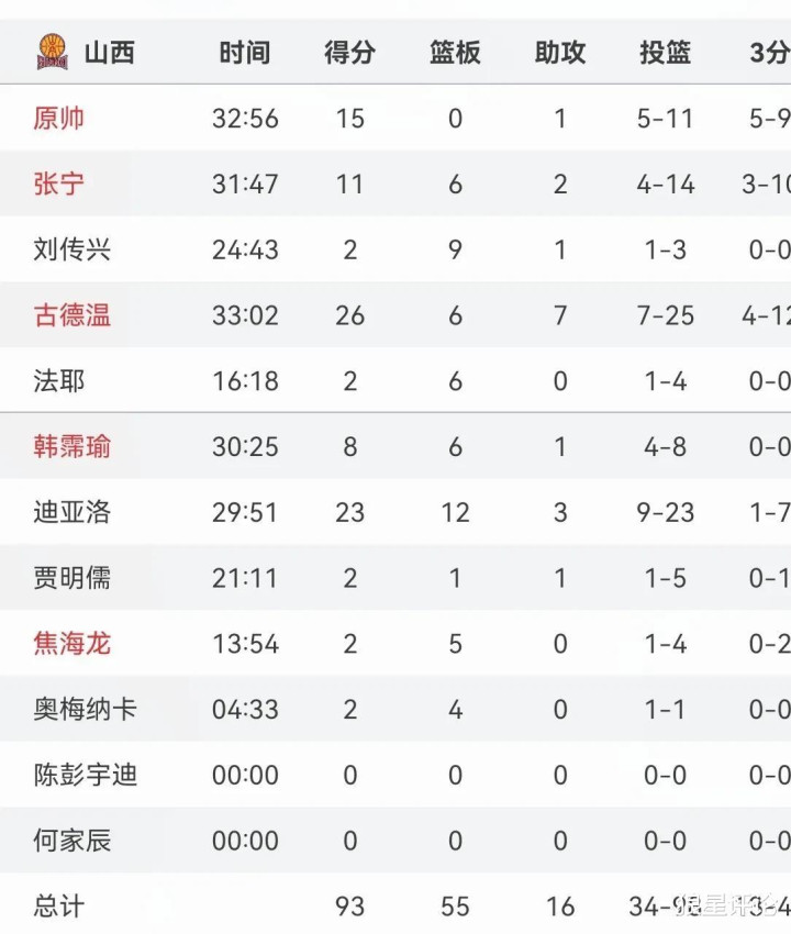 * 山西队方面: 古德温和迪亚洛虽然得分较高,但关键时刻的进攻效率不足,没能带领球队扭转局势。